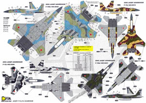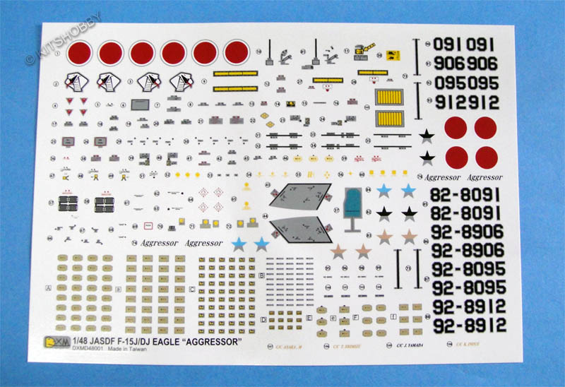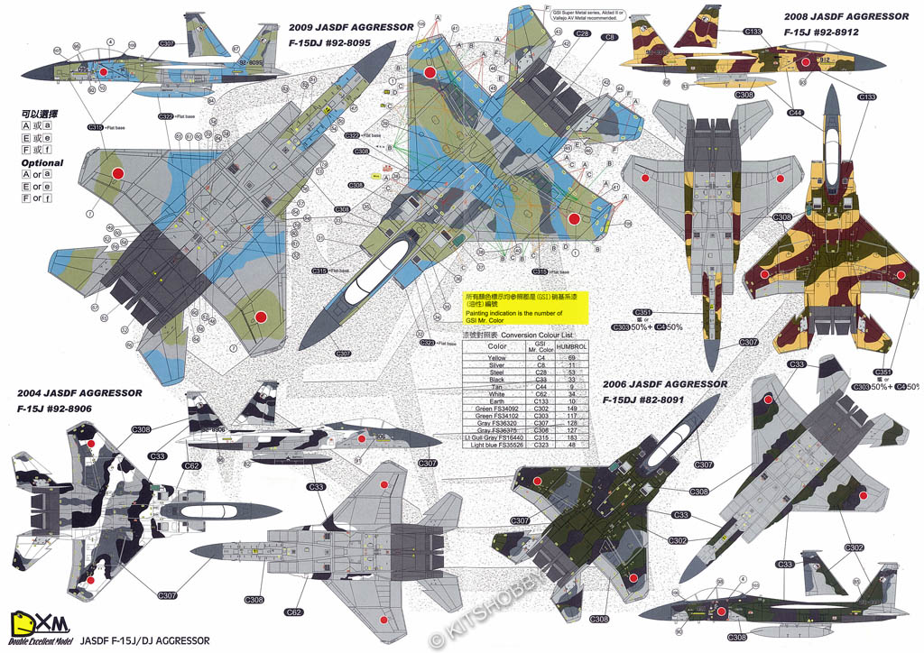 台灣製造. 水貼可以選擇4種不同的日本航空自衛隊(JASDF)F-15塗裝, 並包括1架F-15的機身警告標語