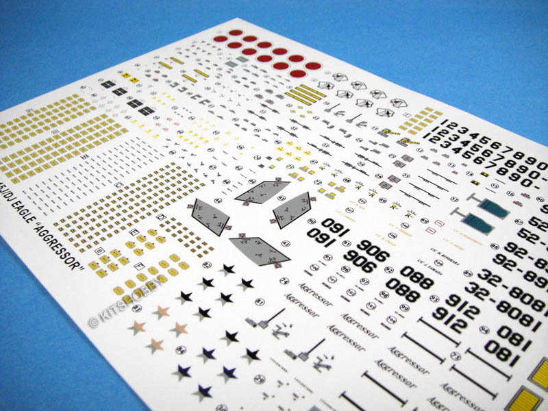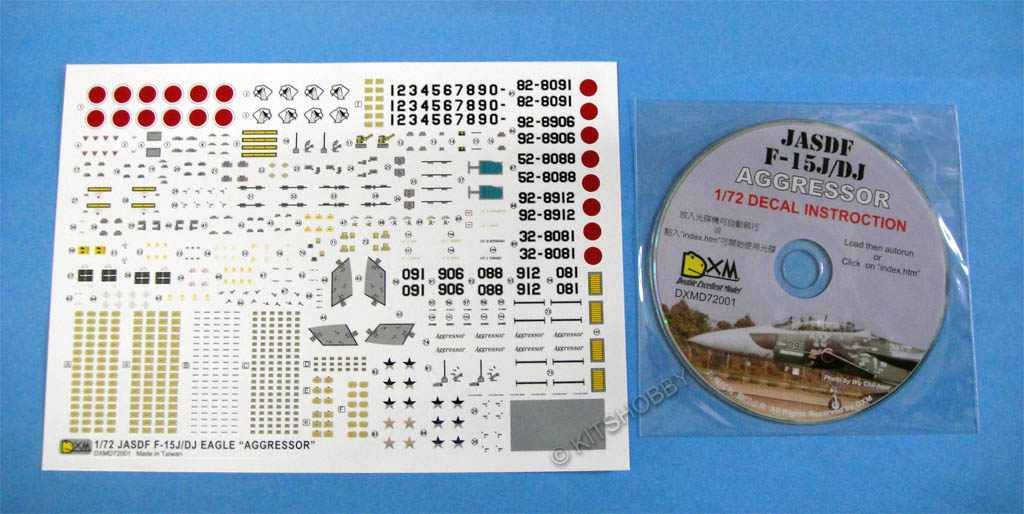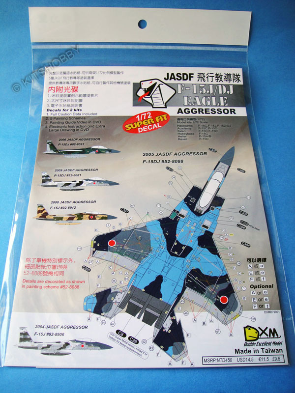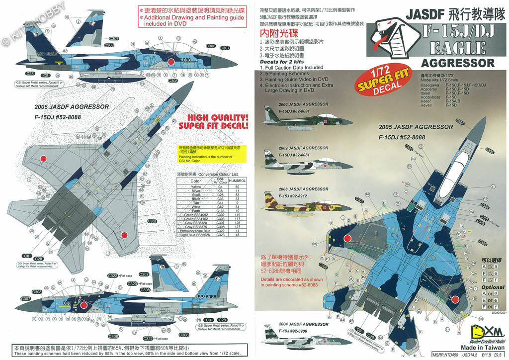 台灣製造. 水貼可以選擇5種不同的日本航空自衛隊(JASDF)F-15塗裝, 機身警告標語足夠製作兩架模型使用