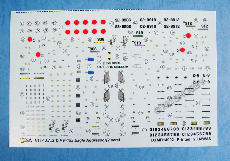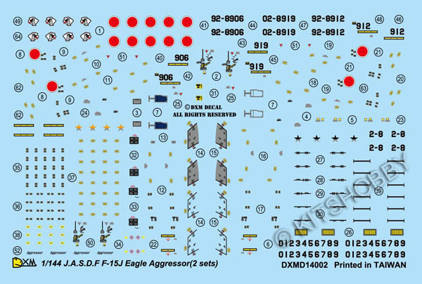 台灣製造. 水貼可以選擇3種不同的日本航空自衛隊(JASDF)F-15塗裝, 機身警告標語足夠製作兩架模型使用