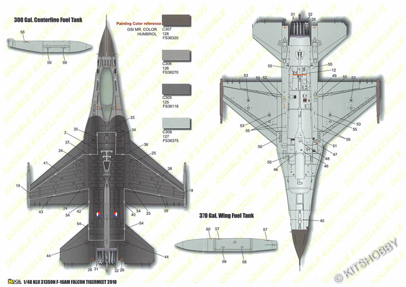 台灣製造. 水貼內含荷蘭皇家空軍F-16AM 313中隊2010老虎會塗裝, 並包括1架F-16的機身警告標語