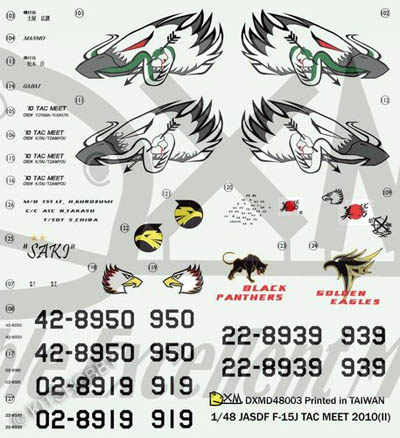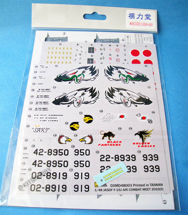 台灣製造. 水貼可以選擇3種不同的日本航空自衛隊(JASDF)F-15塗裝, 並包括1架F-15的機身警告標語