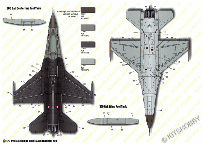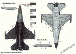 台灣製造. 水貼內含荷蘭皇家空軍F-16AM 313中隊2010老虎會塗裝, 並包括1架F-16的機身警告標語