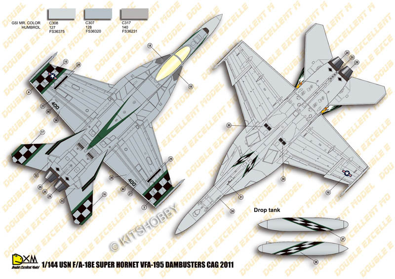 This is a 1/144 scale decal set which designed by DXM workshop. Decals are nicely printed by factory (not ALPS). Decals provide USN F/A-18E VFA-195 Dambusters CAG 2011 ChippyHo markings.