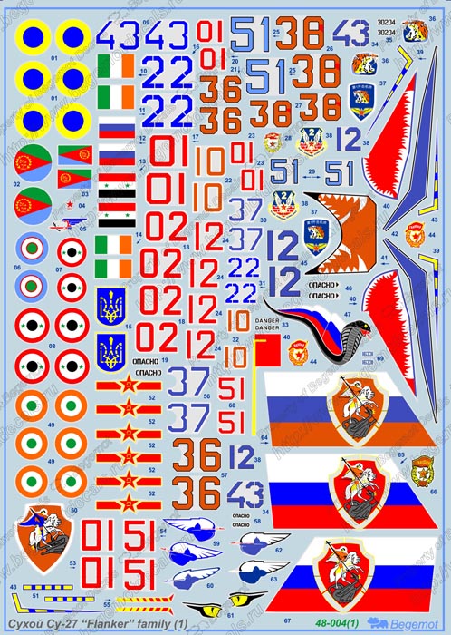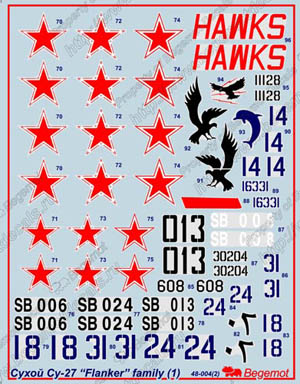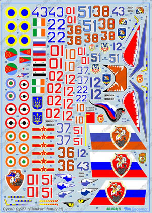 這款水貼可以選擇製作22款不同塗裝的Su-27 ,機型包括Su-27, Su-27UB, Su-30, Su-30K, Su-30MK, Su-30MKI 及 Su-30MKK.
