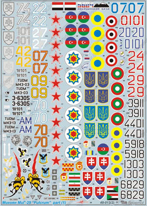 這款水貼可以選擇製作54款不同塗裝的MiG-29 ,機型包括 MiG-29A (9-12), MiG-29C (9-13) 及 MiG-29UB (9-51).