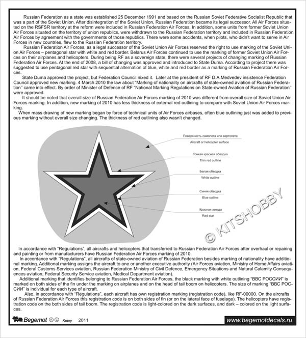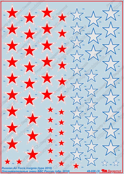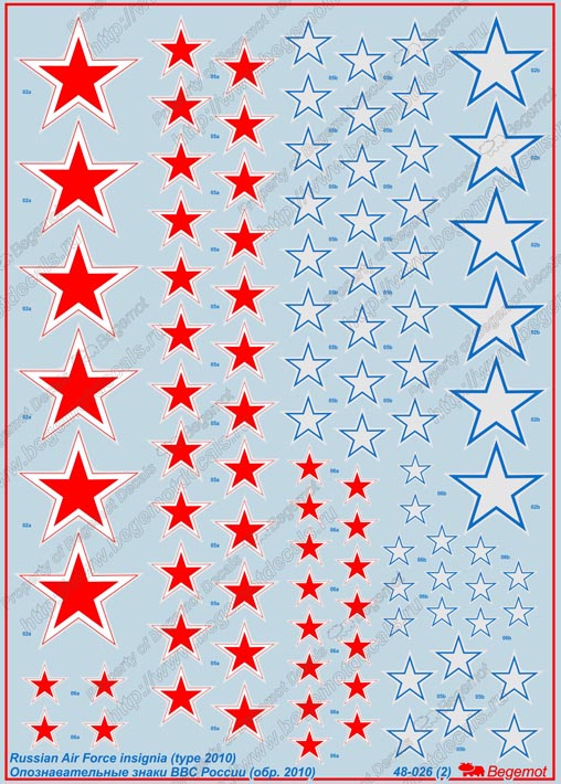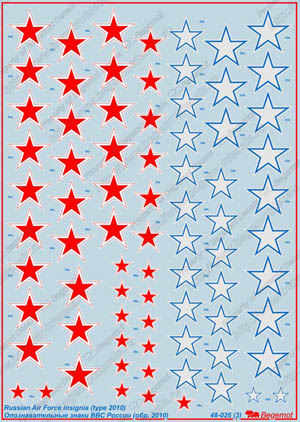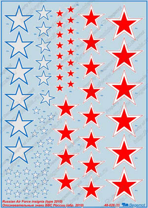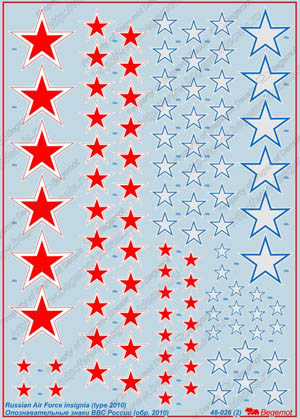 這款水貼包括了7種不同尺寸的俄羅斯空軍軍徽(2010年版本), 適用於各款俄軍飛機和直昇機.