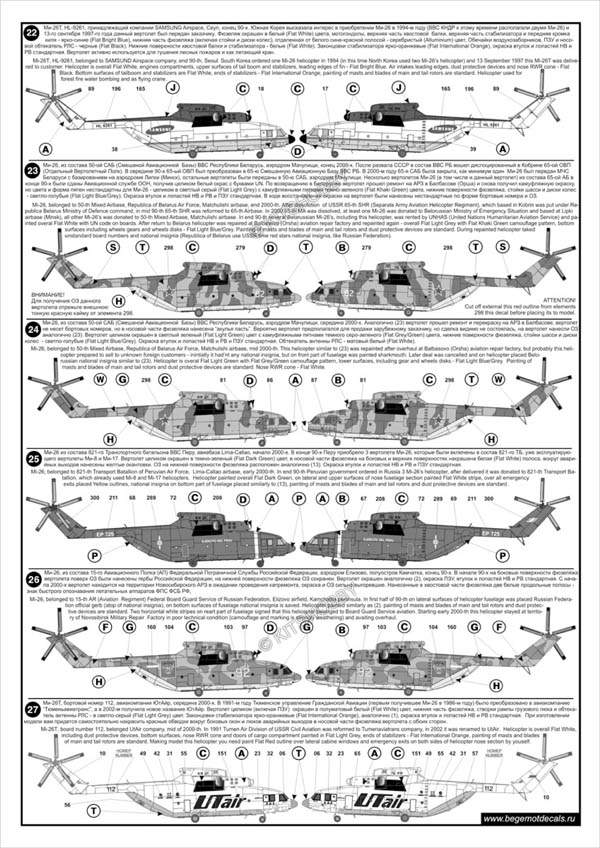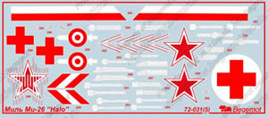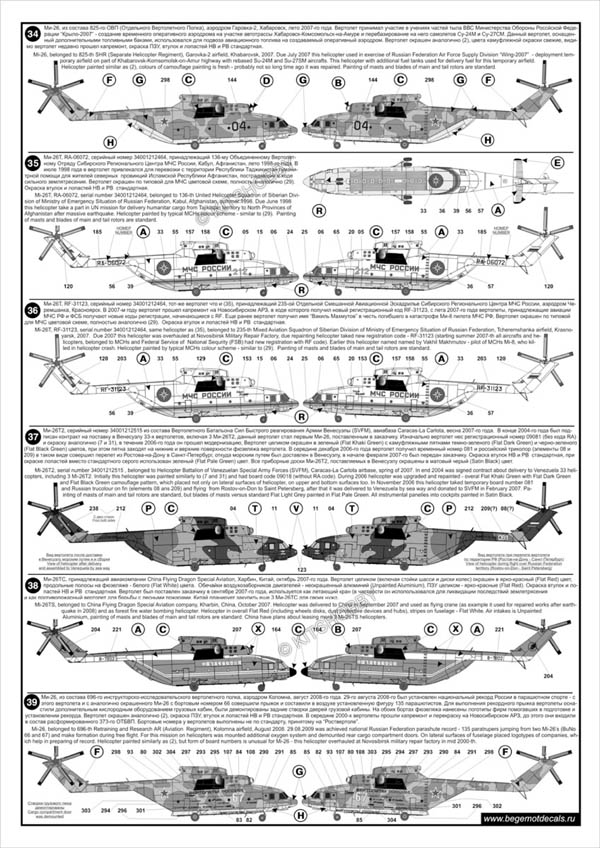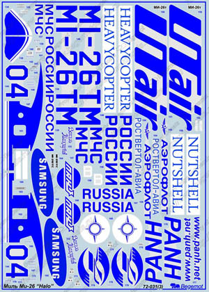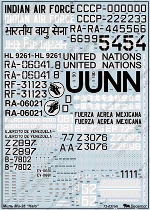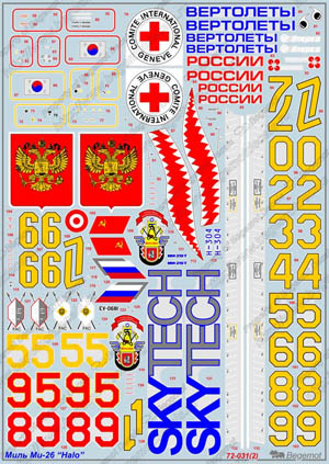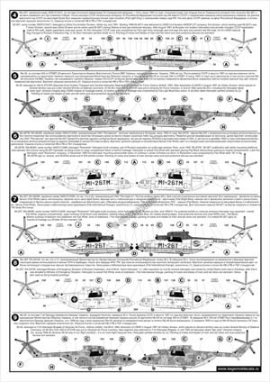 這款水貼可以選擇製作39款不同塗裝的民用或軍用Mi-26T, 此外還包括機身,機艙內部和旋翼的警告標語